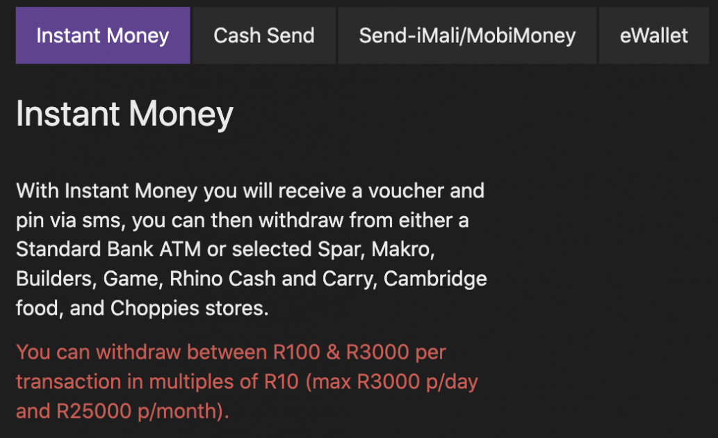 Yes, most of the above options will give you cash from the ATM, You can withdraw between R100 & R3000 per transaction in multiples of R10 (max R3000 p/day and R25000 p/month).